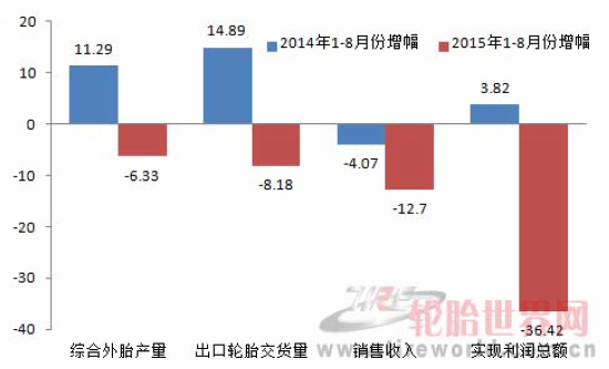 图1:2015年1-8月份与2014年1-8月份轮胎主要指标增幅对比状况(单位:%)