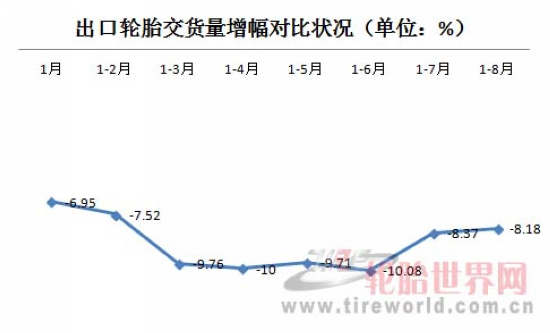 图1-4:2015年1-8月份出口轮胎交货量同比增长趋势状况(单位:%)