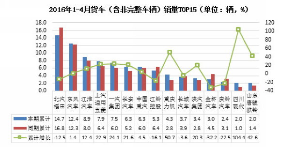 2016年1-4月国内货车累计产量105.59万辆,同比增长2.02%;1-4月国内货车累计销量103.71万辆,同比增长4.65%。其中,北汽福田累计销售货车14.7万辆,排名第一,累计下降12.5%;销量前十五名中,四川现代增幅最大,为104.4%,销售现代2.0万辆。