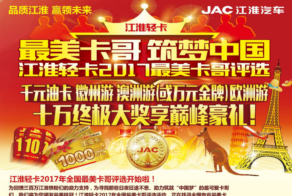 1月16日,江淮轻卡正式宣布,“最美卡哥筑梦中国——2017年全国十大最美卡哥评选”全国上线,千元油卡、万元金牌、徽州游、澳洲游、欧洲游,以及十万终极大奖静候您的到来!
