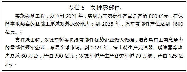 4.零部件支撑作用显著增强。形成由汽车零部件(元器件)到系统总成再到整车制造的完整产业链。到2021年,汽车零部件实现产值800亿元以上,整车产品的本地配套率达到40%以上;到2025年,实现汽车零部件产值突破1600亿元,整车产品的本地配套率达到50%以上,对汽车产业持续发展形成有力支撑。