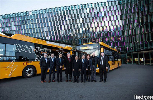 冰岛交通部长、中国驻冰岛大使、冰岛首都公交公司董事长、冰岛前外交部长、宇通海外市场副总经理等人在宇通纯电动车前合影
