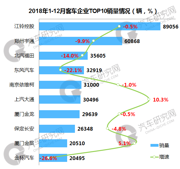 2018年客车企业中,江铃控股位居第一,销量接近9万辆,同比微降0.5%;郑州宇通销量位居第二,累计销售超过6万辆;前十企业中,上汽大通增幅最大,同比增长10.3%,而金杯汽车降幅最大,累计下滑26.6%。