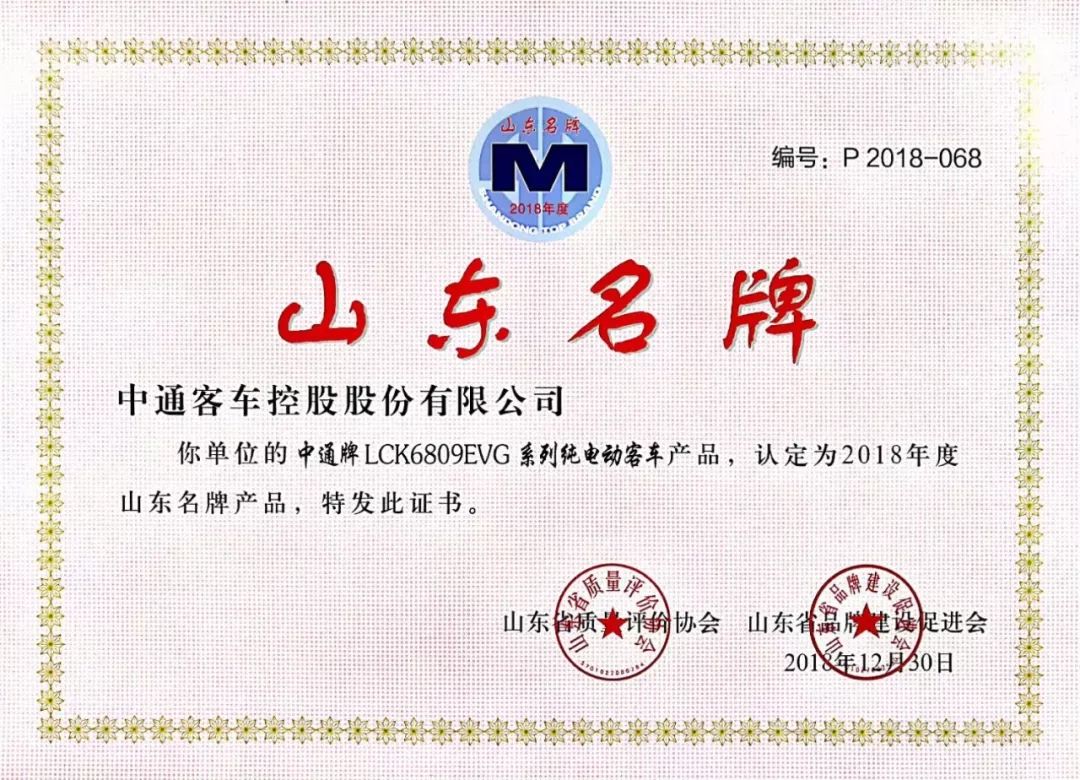 日前,山东省质量评价协会、山东省品牌建设促进会公布了2018年度山东名牌产品名单,并颁发荣誉证书。其中,中通客车四款车型被评为2018年度山东省名牌产品。