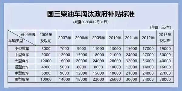 根据淘汰车辆的车型、使用年限给予差别化政府补贴。补贴标准为:国二汽油车2750-9500元/车,国三柴油车4000-40000元/车。