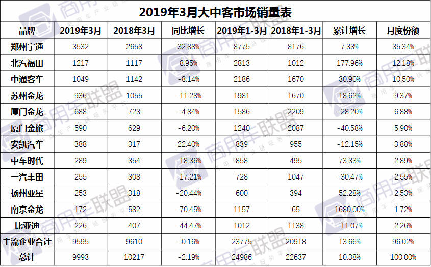 从3月大中客前十企业排名:3增7降,郑州宇通3532辆成绩领跑大中客企业,同比增长32.88%,前十企业中增幅最高,其余两个企业实现增长的企业是北汽福田和安凯客车,分别增长8.95%和22.40%,降幅最高的企业是扬州亚星,超20%,排名二、三位的分别是北汽福田和中通客车,销量均超1000辆。