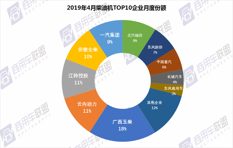 从4月柴油机市场前十企业排名看:广西玉柴销售4.8万台,居首位增幅为17.65%,云内动力紧随其后,同比增长10.97%,江铃控股连续三月实现正增长的,首度进军前三甲,安徽全柴销售2.62万台,同比下降8.67%,排名第四,本月降幅较高的是江淮汽车和一汽集团,分别为35.43%和32%,增幅最高的企业是东风商用车为24.81%。