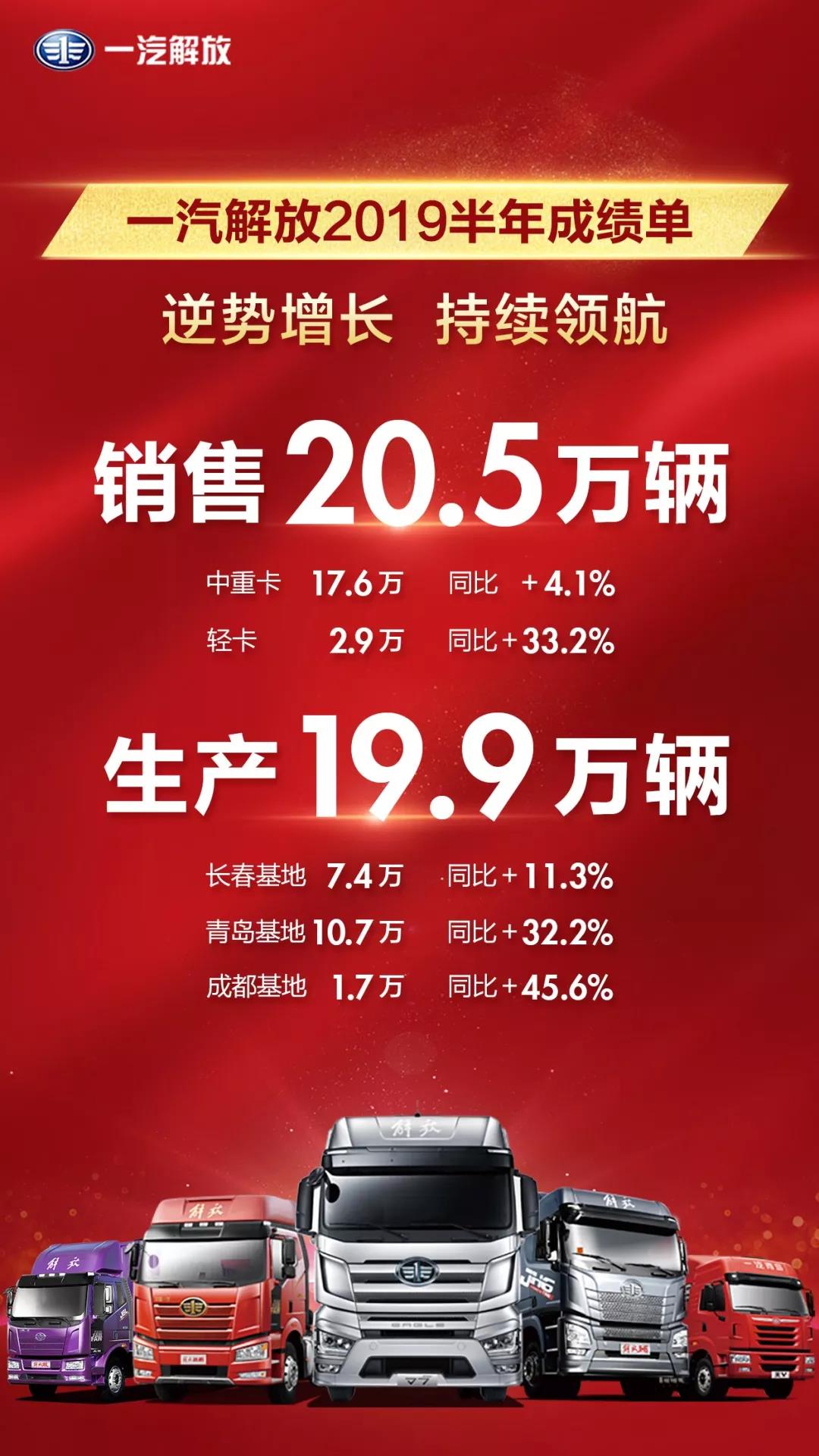 2020年7月15日,以“智领时代勇启新程同心驭势戮力攻坚”为主题的2020年一汽解放营销年中会分别在长春及12个线上云端分会场举行。今年上半年,一汽解放创下了“十个第一”、“五项记录”实现整车销售27.7万辆,同比增长35%,其中中重卡实现销量23.9万辆,市场份额达到27%,较2019年提升5.3个百分点的卓然业绩。
