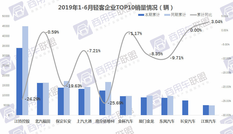 从累计销量排名来看:江铃控股销量超3万辆稳居首位,同比下降24.29%;北汽福田销售16313辆排名第二,同比出现微降;保定长安销售13874辆排名第三,同比下降19.63%。江淮汽车销量为5052辆排名第十,同比增长3.04%,是前十企业中除长安无同期数据外,唯一实现销量增长的企业。