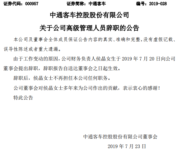 7月23日,中通客车公告称,由于工作变动的原因,公司副董事长宓保伦先生、董事贾开潜先生于2019年7月20日向公司董事会提出辞职,申请辞去公司第九届董事会董事及相关专门委员会职务,辞职后,宓保伦先生不再担任公司任何职务,贾开潜先生继续在本公司工作。