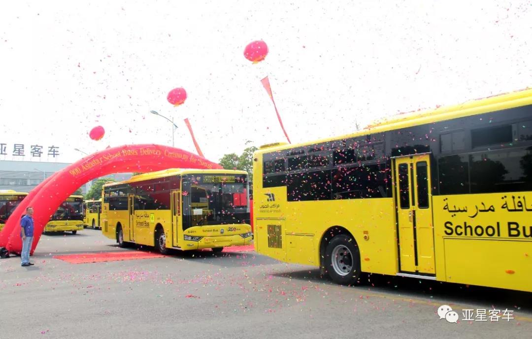 亚星客车专业定制安全可靠这批客车设计均按沙特教育部最新校车要求全新定制,加宽设计的车身,为沙特学生提供更舒适宽敞的车内空间。两种不同米段的车辆亦可分别满足不同线路接送学生量的要求,为客户提供了更优的运营方案。这批亚星客车在安全性方面严格对照沙特校车法规GSO2501逐项落实:前围安装挡臂,车侧安装“STOP”专用停车警示牌,均在车辆停止时自动打开,同时有红色的信号灯闪烁,提醒其它车辆避让,保证学生的上下车安全。前后都安装有雷达,辅助驾驶员的全程驾驶。车辆前方、左前方、右后方等多处专用巡视系统,监控车内外所有角落,便于驾驶员时时查看车内外实时状况,以便第一时间准确处理突发状况。另外车上自带GPS定位,还安装有学生流量监测系统、专用巡视系统、学生滞留提醒系统等。同时,车辆具有门开起步互锁功能,即在车门开启的情况下,车辆不能起步;车辆在起步、运行中不能开启车门;仅有在车辆停稳,车速为零时才能打开车门;如遇突发紧急情况,可从车内外开启应急出口。另外,车身油漆采用专用黄色,确保光线差时,车辆还能明显区分;车身上还印英阿文的校车标注以及投诉举报电话,用于公众监督司机的行为等等这些车内外所运用的多重主被动安全技术,全面保证全车及全体乘员的安全。满足了当地校车的需求,便于管理运营,得到沙特客户的高度认可。本批客车搭载潍柴发动机、法士特变速箱、汉德车桥所构成的黄金动力总成,动力强劲、操纵轻便,完全符合沙特校车标准。亚星客车采用整车电泳工艺,增加车辆的防腐效果,保证车体经久耐用,游刃有余地应对沙特沿海地区多尘土、多飞沙的特殊天气的运营工况。