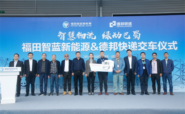 2019年10月22日,福田智蓝新能源与德邦快递交车仪式在成都举行,80台欧马可智蓝(成都42、广州38)正式投入德邦快递城市配送运营行列。德邦投资控股股份有限公司总经理、董事徐恩俊,福田汽车副总经理、福田智蓝新能源总裁陈青山,福田智蓝新能源副总裁王维、张宏亮等双方领导,以及经销商代表出席活动。活动仪式上,福田智蓝新能源副总裁茹宛向德邦快递成都大区总经理黄美交付车辆钥匙。高品质新能源车辆装备助力德邦快递物流绿色运营,双方此次合作共同打造新能源城市物流新标杆,进一步加快成都打造绿色货运示范城市目标的达成。