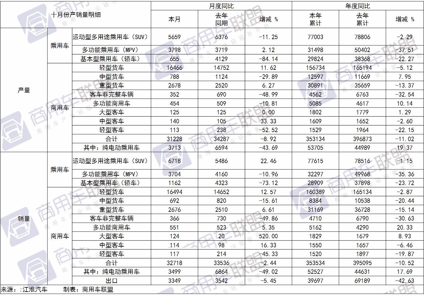 11月8日,安徽江淮汽车集团股份有限公司发布2019年10月产销快报。快报显示,江淮汽车10月份销售各类汽车及底盘32718辆,同比下降2.44%;生产各类汽车及底盘31228辆,同比下降8.92%。重卡领域,10月份,江淮汽车销售重卡2676辆,同比增长6.61%;1-10月,江淮汽车累计销售重卡31169辆,同比下降15.14%。