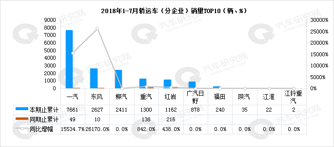 一汽销量高居榜首,1-7月累计销量为7661辆,同比增长15534.7%,其次为东风、柳汽、重汽和红岩,销量分别为2627辆、2411辆、1300辆和1162辆,其次为广汽日野、福田、陕汽、江淮和江铃重汽,几家销量均不足千辆。