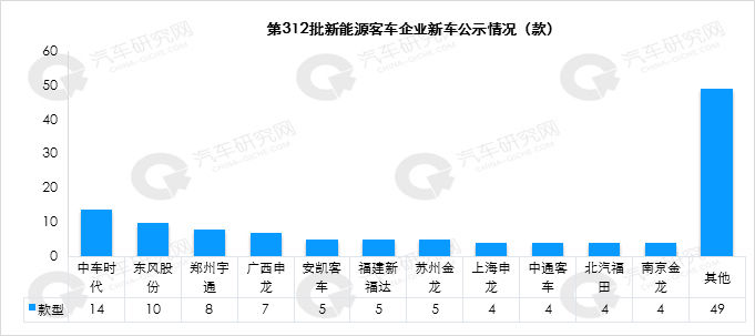 本批共有46家车企的124款客车车型申报,从申报的新能源客车型来看,本批共有45家车企的119款新能源客车车型申报,此次申报的企业主要包括:中车时代和东风股份两家企业均申报10款以上新车型,其他企业申报车型多数在4-5款,目前客车市场进入申报公告车型几乎均为新能源类车型产品。