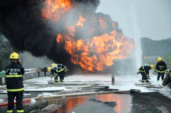 2018年9月6日7时51分,南宁市泉南外环高速互通油罐车在行驶中着火,现场无人员伤亡。南宁市消防支队指挥中心接到报警后,立即派出消防官兵赶往现场。