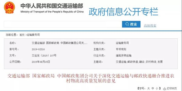 8月19日,交通运输部、国家邮政局、中国邮政集团公司联合印发了《关于深化交通运输与邮政快递融合 推进农村物流高质量发展的意见》,《意见》围绕网络节点共建共享、运力资源互用互补、标准规范统一、企业融合创新等方面,对促进交通运输与邮政快递融合发展提出意见