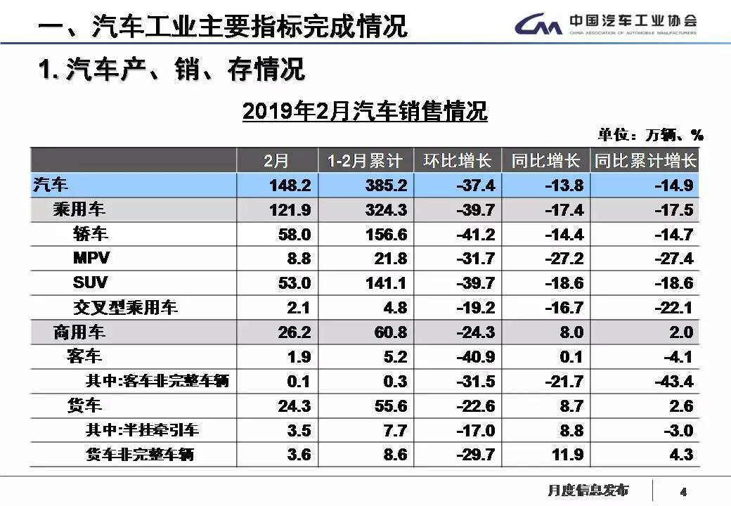 1-2月,汽车产销分别完成377.6万辆和385.2万辆,产销量比上年同期分别下降14.1%和14.9%。