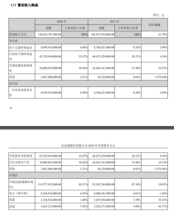 3月27日,比亚迪(002594,SZ)发布的2018年年度报告显示,2018年比亚迪实现营收1300.55亿元,同比增长22.79%;归属于上市公司股东的净利润为27.8亿元,同比下降31.63%。