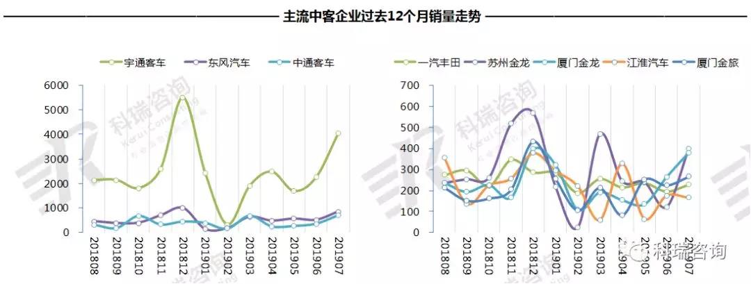 7月,TOP10中客企业销量八升一降一平。宇通客车仍排名首位,且实现大幅增长;其余企业除一汽丰田下滑外,销量普遍大幅增长。