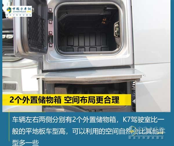 走到车辆侧面,能够看到车辆左右两侧分别有2个外置储物箱,是的,你们没有听错,一边两个。江淮格尔发K7驾驶室比一般的平地板车型高,所以可以利用的空间自然会比其他车型多一些,江淮格尔发很好的利用空间在左右两边做2个储物箱。上面的大号外置储物箱是可以与驾驶室内是互通的,下面小的不规则储物箱是独立空间。可以单独储存一些东西,大的空间放行车物品,小的放脏乱的修理工具。