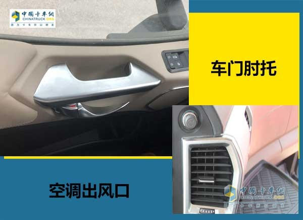 可能是想要与欧洲高端卡车想比拟,但是一些配置有点弄巧成拙,比如驾驶室内暖黄色内饰材料用的过多,特别是在驾驶员经常会触碰到的区域,车门上的浅色肘托就是一个典型例子,后续使用肯定是易脏易磨损的。但实际上在这个司机接触较多的位置使用不耐脏的浅色饰皮显然不是明智的做法,国内重卡的使用工况肯定要比欧洲重卡恶劣得多,若是一昧地照搬欧洲重卡的设计肯定是走不通的。其次就是在空调出风口处的大面积镀铬未免让人感到有点装饰过度,只是单纯的漂亮而已,确实没有实用性可言。