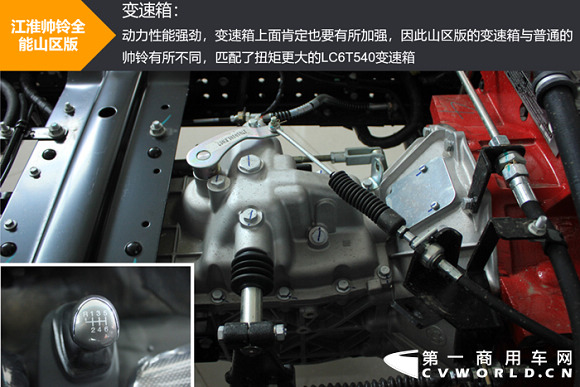 动力性能强劲,变速箱上面肯定也要有所加强,因此山区版的变速箱与普通的帅铃有所不同,匹配了扭矩更大的六安LC6T540铝合金变速箱。这个6挡变速箱不仅重量轻、可靠性更强,换挡操作也更平顺。