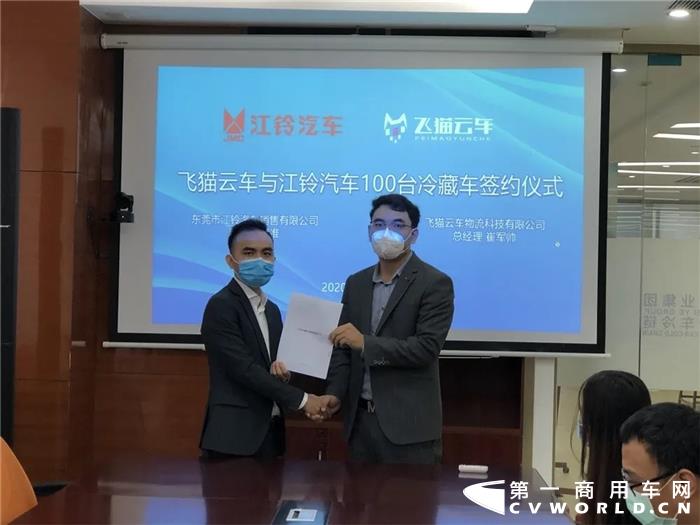 3月2日上午,江铃汽车与飞猫云车在深圳举行100辆冷藏车签约仪式。