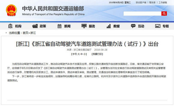 《浙江省自动驾驶汽车道路测试管理办法(试行)》出台