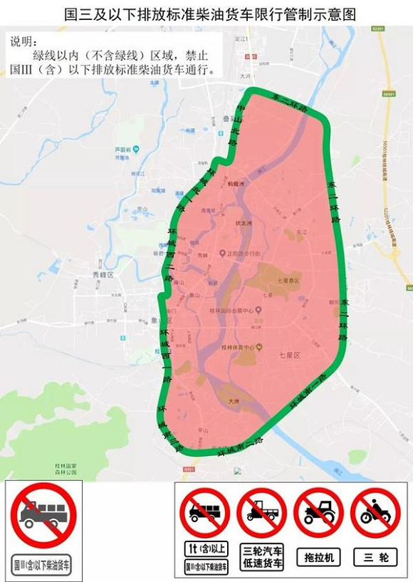 根据《中华人民共和国道路安全法》、《中华人民共和国大气污染防治法》、《广西自治区大气污染防治条例》等有关法律法规规定,以及《桂林市大气污染防治攻坚两年可持续行动计划(2019-2020年)》的工作要求,结合桂林市道路交通流量和机动车污染物排放实际情况,决定对国三及以下排放标准柴油货车实行限行管制措施。现将有关事项通告如下: