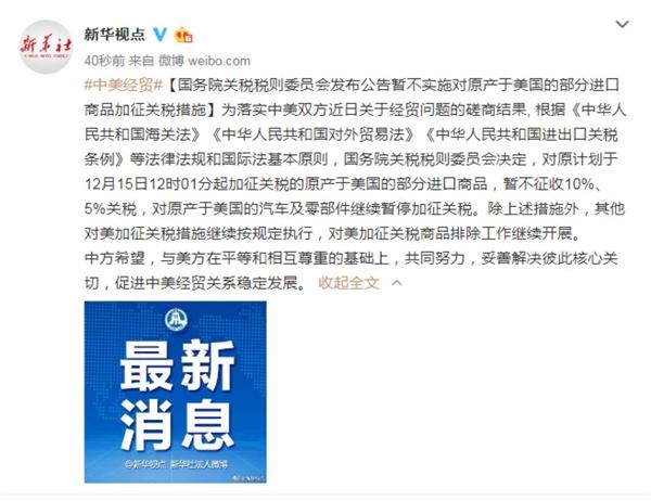 为落实中美双方近日关于经贸问题的磋商结果, 根据《中华人民共和国海关法》《中华人民共和国对外贸易法》《中华人民共和国进出口关税条例》等法律法规和国际法基本原则,国务院关税税则委员会决定,对原计划于12月15日12时01分起加征关税的原产于美国的部分进口商品,暂不征收10%、5%关税,对原产于美国的汽车及零部件继续暂停加征关税。除上述措施外,其他对美加征关税措施继续按规定执行,对美加征关税商品排除工作继续开展。