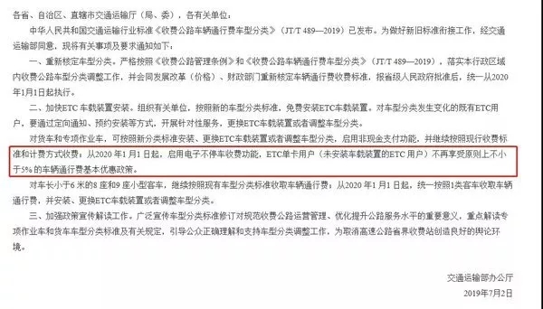 交通部发布的《收费公路车辆通行费车型分类》中表示,从2020年1月1日起,启用电子不停车收费功能,ETC单卡用户(未安装车载装置的ETC用户)不再享受原则上不小于5%的车辆通行基本优惠政策。