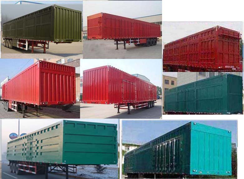 备注 车辆整车高度分别为4000mm,3800mm,3600mm,3400mm.一一对应车厢底板至厢体顶部的高度为2400mm,2200mm,2000mm,1800mm;厢体高度可以调整.选装少片弹簧,具有整备质量轻的特点,后部选装对开全封闭门,样式为横瓦楞、竖瓦楞、两层竖瓦楞、三层竖瓦楞,选装全封闭前门,样式为横瓦楞、竖瓦楞、两层竖瓦楞、三层竖瓦楞,车厢箱板选装横瓦楞、竖瓦楞、两层竖瓦楞、三层竖瓦楞、方管平板、方管十字花样式及一对开、两对开、三对开,侧、前、后部样式可任意组合,选装空气悬挂。由于牵引车高度不同,而使半挂车总高度不同。该车装有梁山海纳电子科技发展有限公司的HNABS4S/4M型ABS,侧防护装置采用3mm厚的Q235板材压制成槽钢制造,后防护装置采用Q235B槽钢制造,侧后防护装置与车辆采用电焊连接,后防护装置的断面尺寸高为140mm,宽为60mm,离地高度为530mm,
