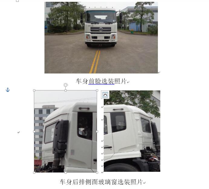 | 备注 | 1.在后部安装车身反光标识和车尾标志板;2.随底盘选装驾驶室及附件,仅选配轴距3800mm底盘,3.选装发动机ISD160 50,油耗对应值为(L/100km)23.98.4.侧面和后下部防护装置材质:Q235-A,与底盘大梁连接方式:螺栓连接;5.后下部防护装置截面尺寸:160×50mm,离地高度:520mm.6.安装具有卫星定位功能的行驶记录仪.7.装有ABS,ABS型号:3631010-C2000,生产厂家:东风电子科技股份有限公司制动系统公司.8.随底盘可选装取消驾驶室顶部装饰灯、取消雾灯;9.可载运的垃圾厢尺寸为(长×宽×高):3600×2400×2100,车厢顶部封闭不可开启。 | ||