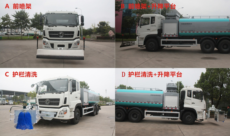 | 备注 | 选用4350+1350mm轴距底盘,装有ABS,型号:3631010-C2000;生产厂家:东科克诺尔商用车制动系统(十堰)有限公司.罐体外形尺寸(长轴×短轴×长度)(mm):2280×1480×5000,运输介质名称:水,密度1000千克/立方米;该车工作装置有4种配置:A(前喷架),B(前喷架+升降平台),C(护栏清洗装置),D(护栏清洗装置+升降平台);配置A或C时:前伸1200mm,外形尺寸高度为3070,整备质量为11800,额定载质量为13070,有效容积13.72立方米;配置B或D时: 前伸1200mm,外形尺寸高度为3300,整备质量为12300,额定载质量为12570,有效容积13.19立方米;侧面防护装置的材料为铝合金,连接方式为螺栓连接;后防护装置材料为Q235A,连接方式为螺栓连接,断面尺寸为140×60mm,离地高度为475mm,可选装前冲、鸭嘴、后箭头指示灯、后部上、下喷雾、左、右花洒等装置;专用装置由水泵、清洗装置、前喷装置、护栏清洗装置、升降平台及罐体等组成,专用功能为道路清洗、保洁、护栏清洗等作业.随底盘选装驾驶室顶部装饰灯,选装前雾灯,选装驾驶室卧铺侧窗装饰板 | ||