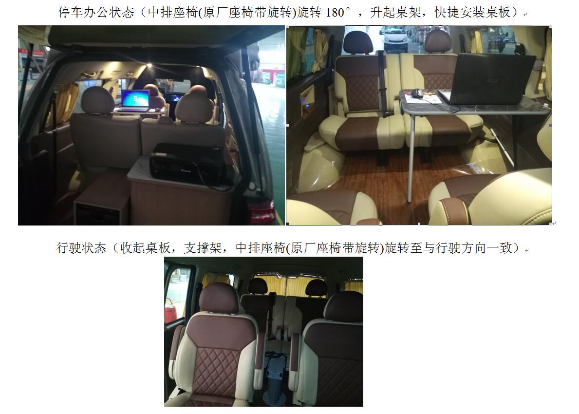 | 备注 | 1.车内配备折叠办公桌椅、车载电脑、打印复印一体机等办公设备。2.在原车顶部加装顶装饰件高度为2100mm。3. 发动机净功率(KW):103。4.ABS型号/企业:ABS D京西重工(上海)有限公司。 | ||