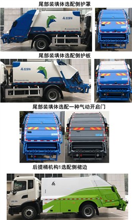 | 备注 | 该车仅选用底盘轴距3800mm,该车具有后伸1730mm,该车尾部装填体可选装一种侧护罩.该车并可选装一种侧裙边结构,选装侧裙边结构时,车辆侧部防护为侧裙边车身替代.该车尾部提桶机构可选装一种橡胶挡块.该车配置ABS,ABS型号/生产厂家:3631010-C2000/东科克诺尔商用车制动系统(十堰)有限公司,ABS 8/东科克诺尔商用车制动系统(十堰)有限公司,4460046450/威伯科汽车控制系统(中国)有限公司; 发动机D4.5NS6B190,DDi50E190-60,B6.2NS6B210对应油耗值分别为20.8 L/100km,20.5L/100km,20.9L/100km.该车安装具有卫星定位功能的行驶记录仪.侧防材料铝合金,螺栓连接.后防护由车辆后部结构代替,离地高315mm.该车装备有垃圾箱体,液压装置及垃圾装填器,用于将垃圾自行压实装入,转运和卸料功能 . | ||