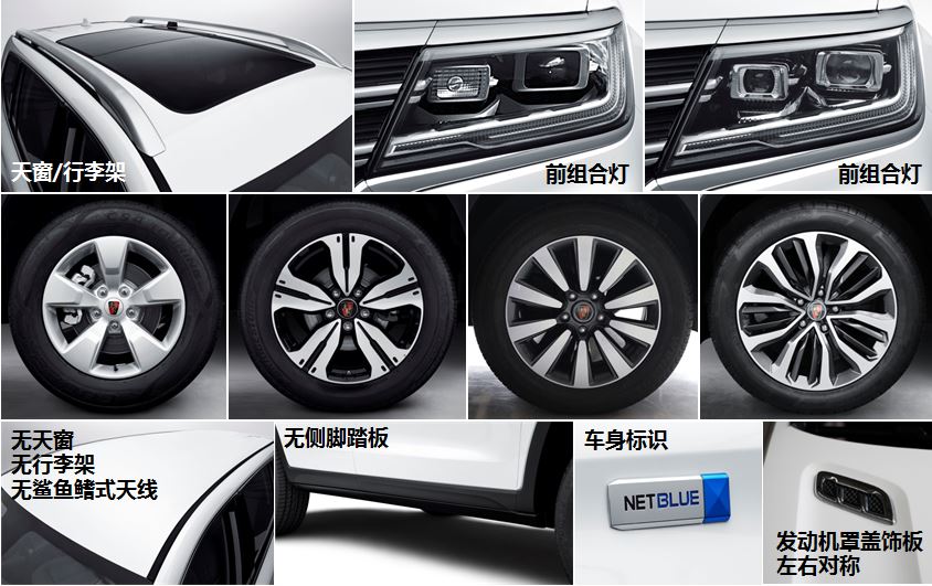 | 备注 | 选装轮毂,LED前组合灯,鲨鱼鳍式天线,行李架(不带行李架车高为1810mm,带行李架或鲨鱼鳍式天线车高为1840mm),天窗,车门下方侧脚踏板,车身标识.ABS型号及生产企业:MK100,大陆泰密克汽车系统(上海)有限公司.发动机最大净功率162kW. | ||