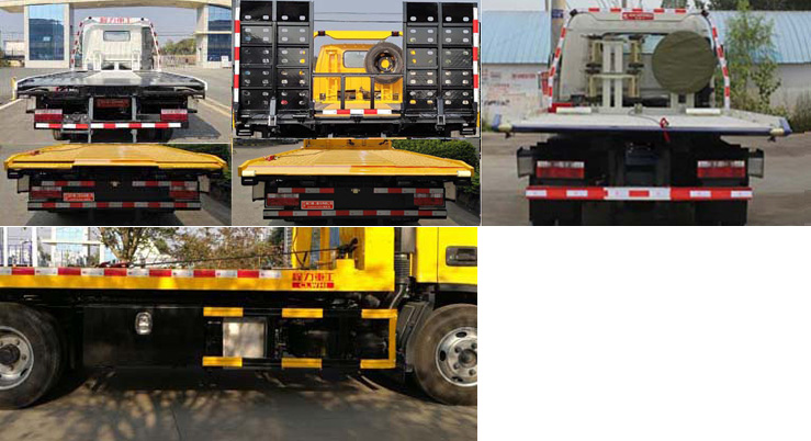 | 备注 | 1.托举质量(kg)与准乘人数(人)对应关系为505/3, 570/2;2.防护材料:Q235B碳钢,连接方式:左右侧面防护采用螺栓连接,后下部防护由专用装置替代,可豁免,后部装置离地高度为450mm;3.ABS系统控制器型号:44600XXXX0,生产厂家:威伯科汽车控制系统(中国)有限公司;4.后栏板收起状态水平长度260mm;5.该车专用装置为托臂,用于托移道路故障车辆,城市违章车辆等工作;6.随底盘选装驾驶室,选装后部结构,选装龙门架样式;选装工具箱位于车身右侧。7.可选装全落地外观。 | ||
