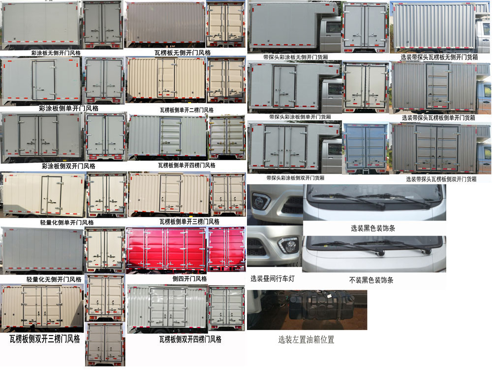 | 备注 | 货厢顶部封闭不可开启.发动机4A2-88C53对应的油耗值为7.5/100km.选装昼间行车灯.选装黑色装饰条.选装导流罩,选装不带探头货箱,选装不带侧开门彩涂板风格货箱,选装侧双开门彩涂板风格货箱,选装侧双开门瓦楞板风格货箱,选装侧单开门瓦楞板风格货箱,选装不带侧开门瓦楞板风格货箱.ABS型号为YF9,生产厂家为武汉元丰汽车电控系统有限公司. | ||