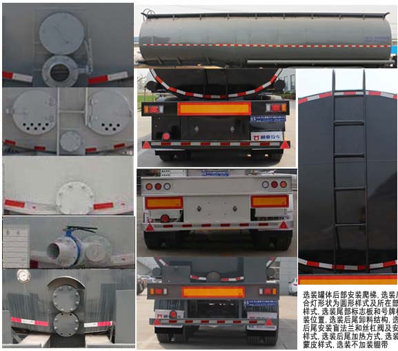 | 备注 | 该车为非危化品运输车辆,罐体有效容积:34.5立方米,允许运输介质的最大密度为:930千克/立方米,罐体为鹅颈式,该车加装保温层,保温层厚度为50mm和80mm两种,当外形尺寸长(mm)为:10400时,保温层内部罐体外形尺寸型为(mm):长9800,宽2350,前端高1900,后端高2080,;当外形尺寸长(mm)为:9800时,保温层内部罐体外形尺寸型为(mm):长9300,宽2350,前端高1900,后端高2080;ABS系统生产厂家:广州瑞立科密汽车电子股份有限公司,梁山顺安达汽车科技有限公司,广州市西合汽车电子装备有限公司,型号:CM2XL-4S/2M,SAD-ABS4S/2M,XH-GQ4S2M-E01;侧面及后下部防护装置所用材料材质均为:Q235,侧面防护装置与车辆连接方式为:螺栓连接,后下部防护装置与车辆连接方式为:焊接,后部防护装置的主要尺寸参数:断面尺寸(mm)为120×68,离地高度为:500mm;选装阀门箱及个数(一个或两个),选装罐顶升降护栏,选装罐体后部安装爬梯,选装后组合灯形状为圆形样式及所在部件样式,选装尾部标志板和号牌板安装位置,选装后尾卸料结构,选装后尾安装盲法兰和丝杠阀及安装样式,选装后尾加热方式,选装外蒙皮样式,选装不加装绷带;车长/牵引销到车辆最前端距离/轴距/后悬的对应关系为:9800/1200/4630+1310+1310/1350,10400/1400/4930+1310+1310/1450,10400/1250/5080+1310+1310/1450. | ||