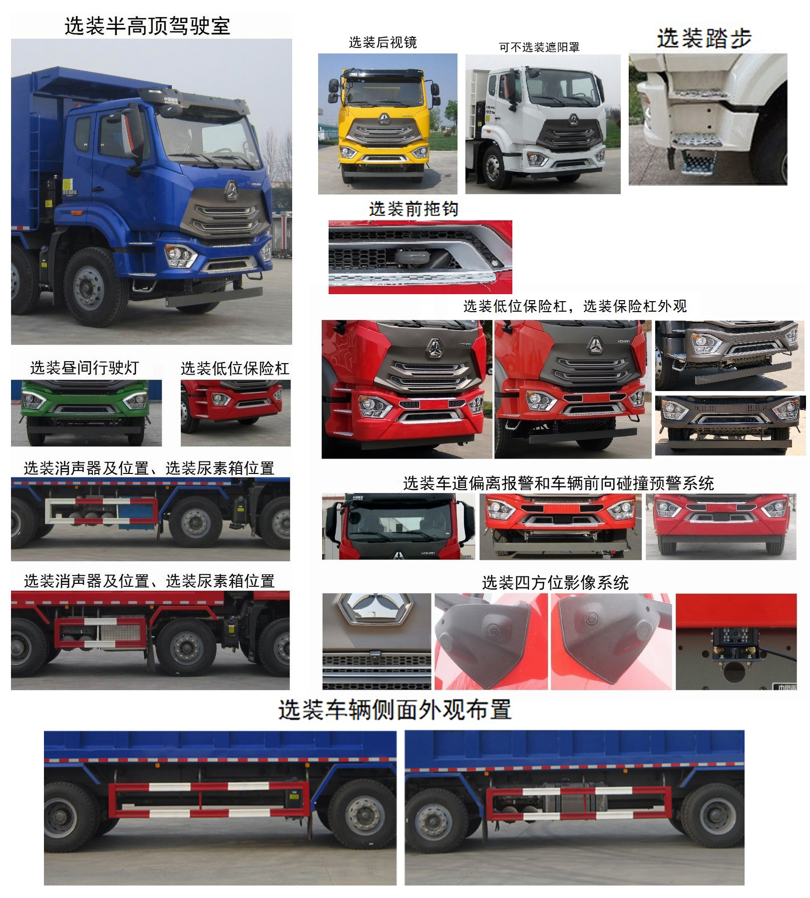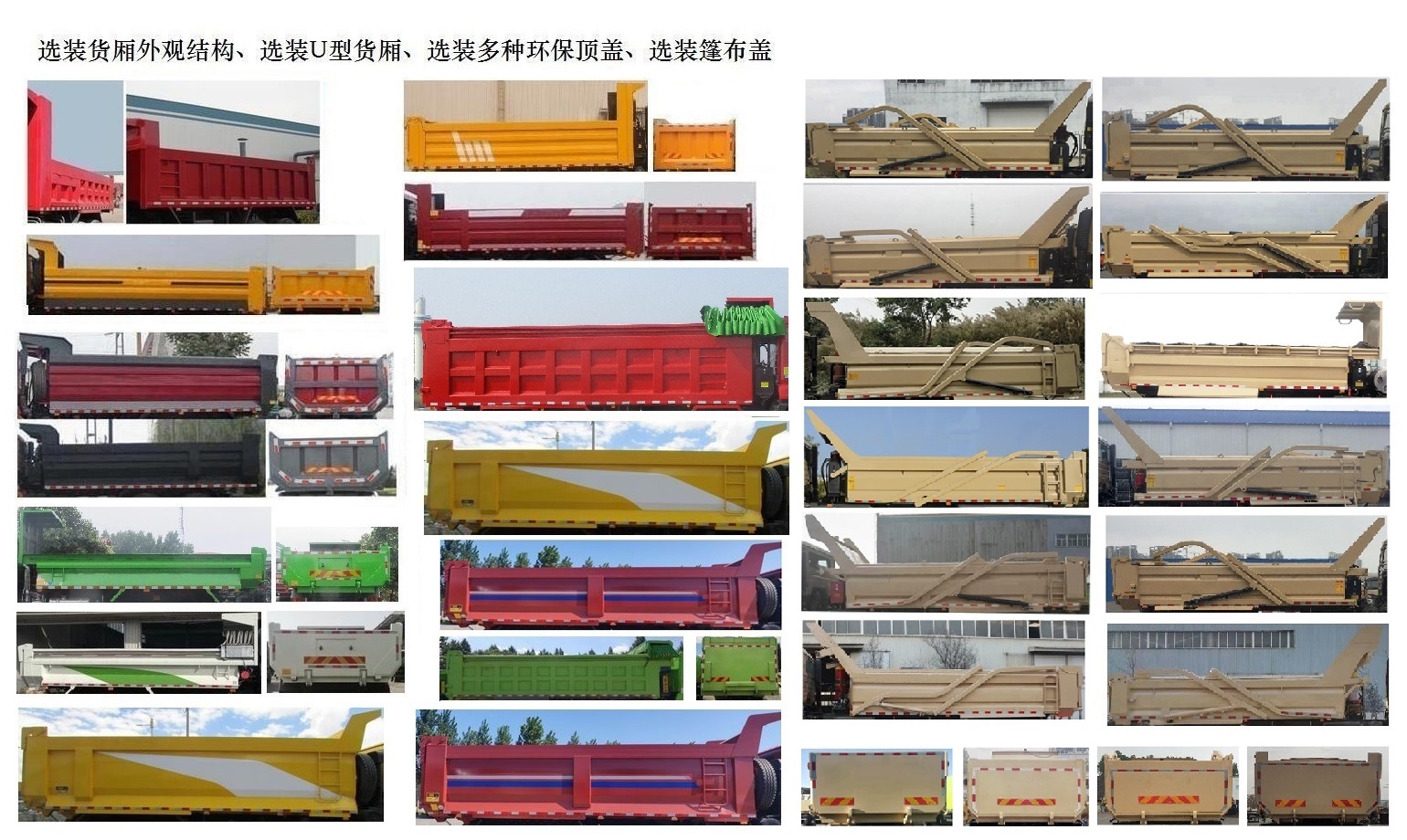 | 备注 | 该车选装半高顶驾驶室时,整车高度为2800mm或3550mm;选装高顶驾驶室时,整车高度为3700mm。该车可选装低位保险杠。选装昼间行驶灯。选装消声器。选装消声器位置。选装尿素箱位置。该车仅选装二类底盘的1800+4600+1350,1800+4575+1400轴距。车长与轴距、后悬、货箱内长尺寸对应关系如下:11110/1800+4600+1350/1810/8200,11110/1800+4575+1400/1785/8200,11310/1800+4600+1350/2010/8500,11310/1800+4575+1400/1985/8500。货箱自卸方式为后卸。该车可选装不同的货箱结构。选装U型箱, U型箱侧裙板为选装件。选装多种环保顶盖结构(包括篷布盖)。货箱上前伸的帽檐可取消。该车装MC09.35-60、MC09.35B-60、MC09.38-60、MC11.40-60、MC11.44-60、WP10H400E62发动机对应的油耗申报值均为40.5L/100km。侧面防护装置所用材料材质为Q235A,连接方式为螺栓连接;后部防护装置所用材料材质为Q235B,连接方式为螺栓连接,断面尺寸为120mm×120mm,离地高度为480mm。ABS系统型号为446 004 6300,ABS生产企业为威伯科汽车控制系统(中国)有限公司。安装具有卫星定位功能的行驶记录仪。 | ||