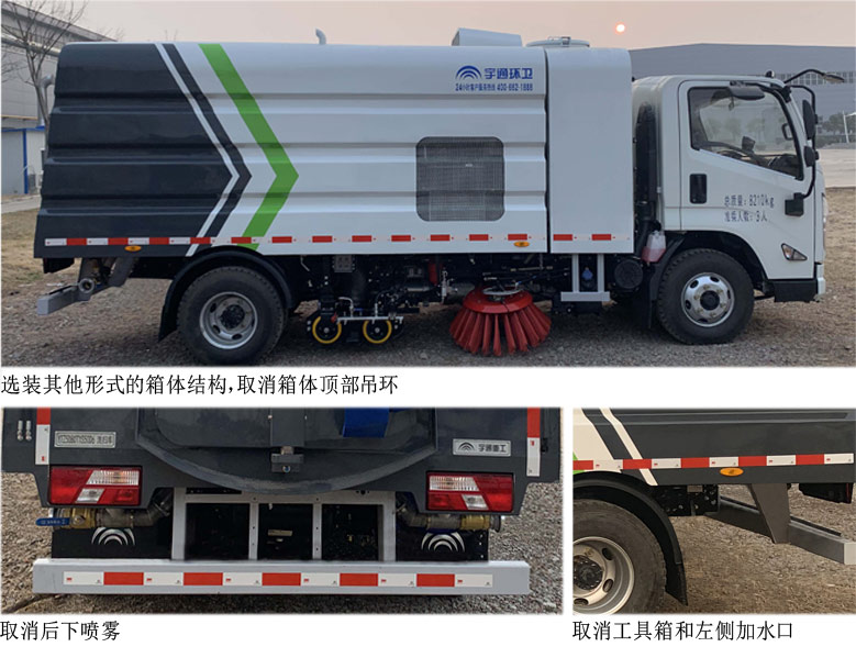 | 备注 | 1.装有垃圾箱和清扫装置,用于城市道路,机场,码头,广场,隧道,桥梁等路面的机械化清扫,喷雾降尘等清洁作业。2.侧防护装置材料为Q355,与车辆采用螺栓连接;后下部防护装置材料为QSTE700,与车辆采用螺栓连接,断面尺寸为120×80(mm),离地高度为470(mm)。3.可选装其他形式的箱体结构。4、可取消箱体顶部吊环、工具箱、左侧加水口和后下喷雾。5、ABS系统型号/厂家:VIE ABS-II/浙江万安科技股份有限公司。 | ||