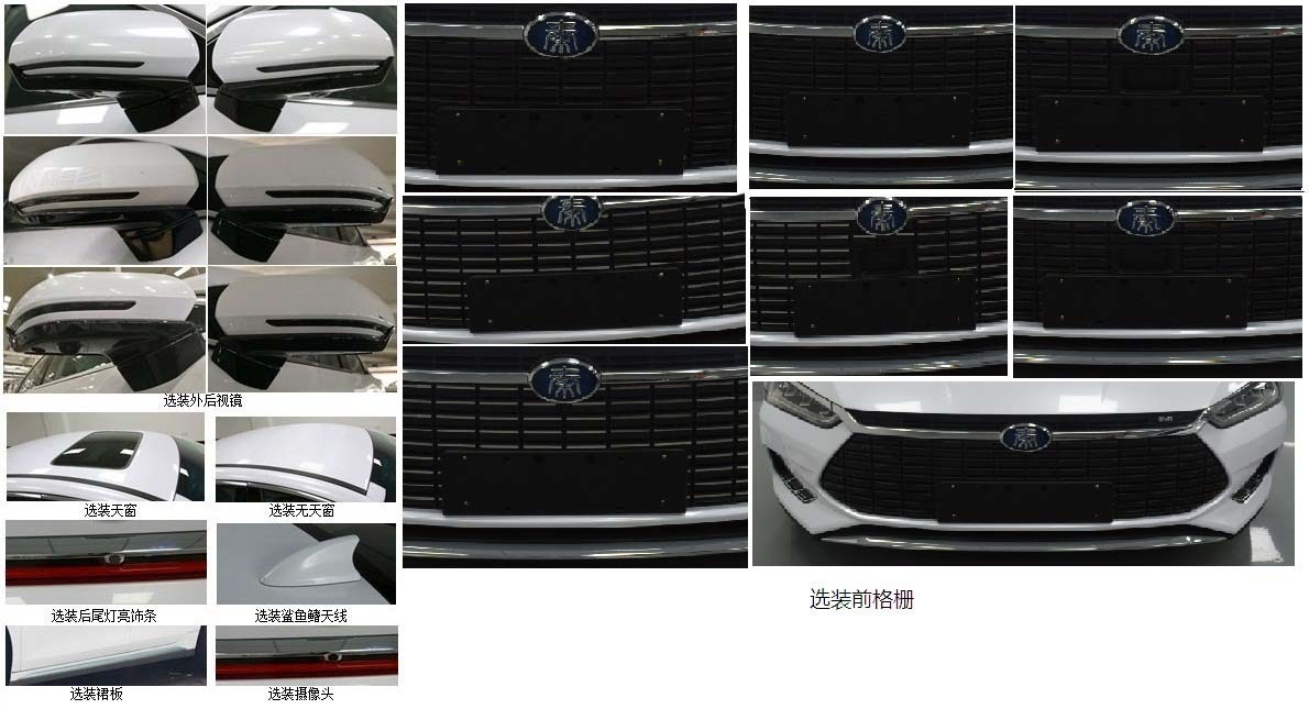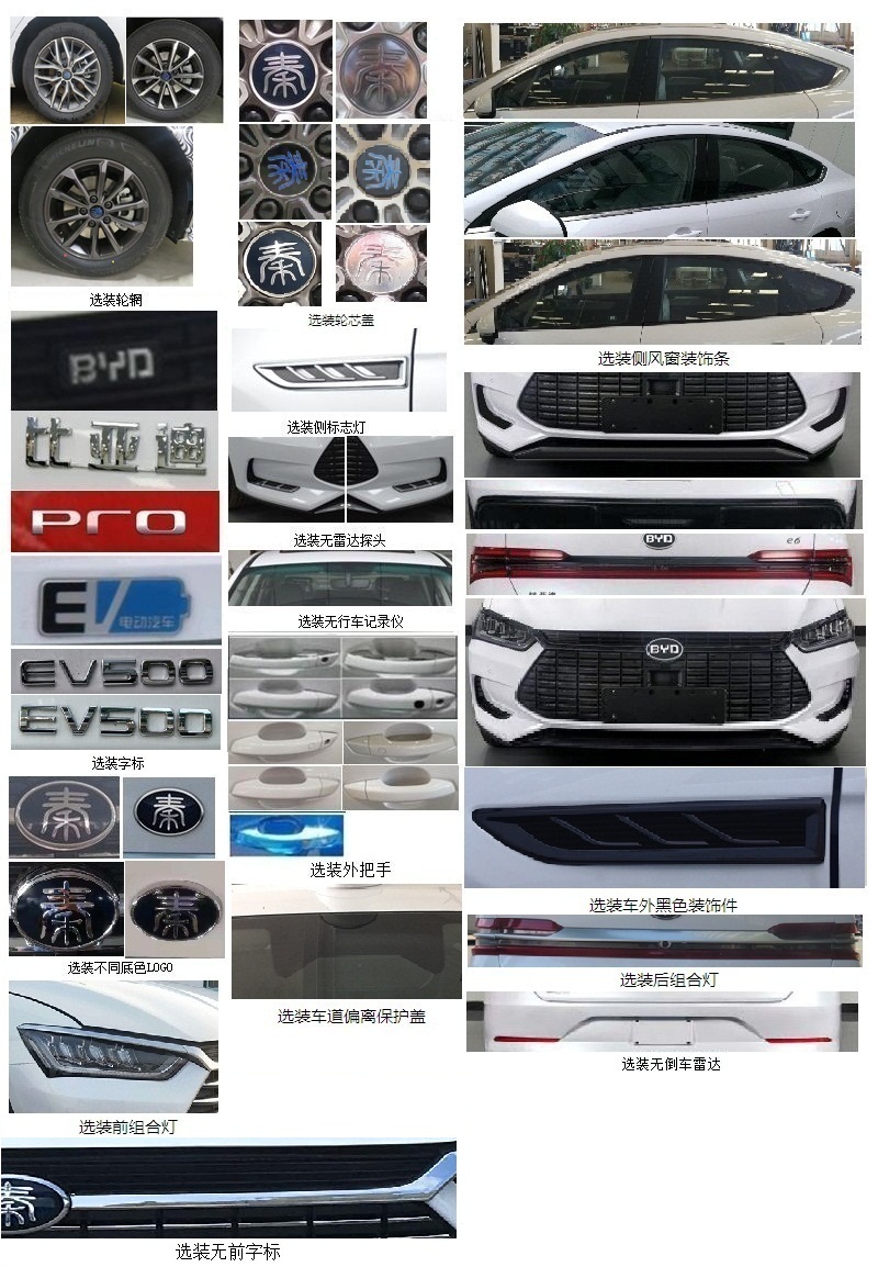 备注 | 选装前格栅,外后视镜,轮辋,轮芯盖,前组合灯,后组合灯,天窗,无天窗,摄像头,字标,不同底色LOGO,无雷达探头,无倒车雷达,无行车记录仪,外把手,鲨鱼鳍天线,侧标志灯,后尾灯亮饰条,裙板,车道偏离保护盖,侧风窗装饰条,车外黑色装饰件,无前字标,侧气囊和侧气帘;ABS型号:ESP,生产企业:博世汽车部件(苏州)有限公司;储能装置种类:镍钴锰酸锂电池,单体生产企业:青海比亚迪锂电池有限公司,总成生产企业:太原比亚迪汽车有限公司;驱动电机类型:永磁同步电机,型号:BYD-1814TZ-XS-B,额定功率:35kW,峰值功率:100kW,生产企业:长沙市比亚迪汽车有限公司;LGXCE6DB×××××××××为带安全气囊的车型VIN号,LGXCE6CB×××××××××为带安全气囊和侧气帘的车型VIN号;允许外接充电,可全国销售。 |