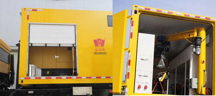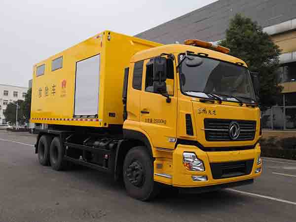 备注 | 左、右侧防护装置对称;侧防护与副车架螺栓连接,材质为Q235A,后防护与大梁螺栓连接,材质为Q235A,后防护断面尺寸为140×80(mm),后防护下边缘离地高度为480mm;仅选用轴距4350+1350(mm);当驾驶室准乘人数为2人时,整备质量为24870kg;ABS生产厂家:东科克诺尔商用车制动系统(十堰)有限公司;型号:3631010-C2000。该车专用装置为发电机组、拉臂勾、液压渣浆泵等工程应急救险用工具,主要用于电力系统、市政和矿山等系统的应急救险。 |