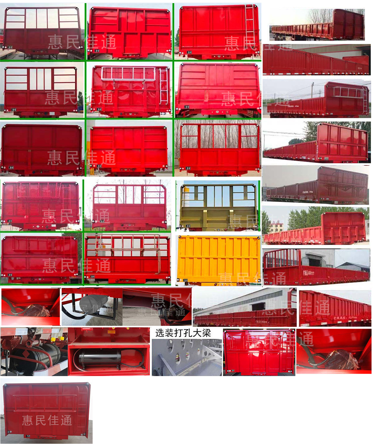 备注 | 该车为侧卸,选装侧面样式(每侧可选4扇门,5扇门,6扇门,整车栏板选装竖瓦楞,方管平板,方管十字花样式,选装吊开门及下开门结构).选装后部灯具样式及后推车器样式,选装前档样式,选装大梁异形孔,选装两侧装工具箱或不装工具箱,选装网式工具箱,车长/牵引销至车辆最前端的距离/轴距/后悬尺寸对应关系:13000/1200/6850+1310+1310/2330,13000/1300/6750+1310+1310/2330,13000/1400/6650+1310+1310/2330,12500/1300/6450+1310+1310/2130,12000/1300/6250+1310+1310/1830,ABS:型号:HNABS4S/4M;生产厂家:梁山海纳电子科技发展有限公司,侧后防护材料均采用Q235B,与车身的连接方式为焊接,后下部防护装置的断面尺寸(mm):140×55,离地高度480mm. |