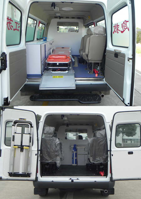 | 备注 | 随底盘选装前脸,轮罩盖。车顶可选装换气扇、照明灯、圆柱形爆闪灯。车顶四侧可选装一对或多对爆闪警示灯(有正方形和长方形两种外观样式可选)。车厢内左侧安装有医疗器械柜时,车辆左侧车窗及尾门窗可选装盲窗。选装三种样式尾门踏板,选装尾门踏板时车长4900mm,对应后悬1083mm。配备医疗器械柜,氧气瓶,紫外线消毒灯,输液夹持器等专用装置。ABS系统控制器型号:APG3550500G;ABS系统控制器生产企业:浙江亚太机电股份有限公司。 发动机最大净功率83KW。 | ||