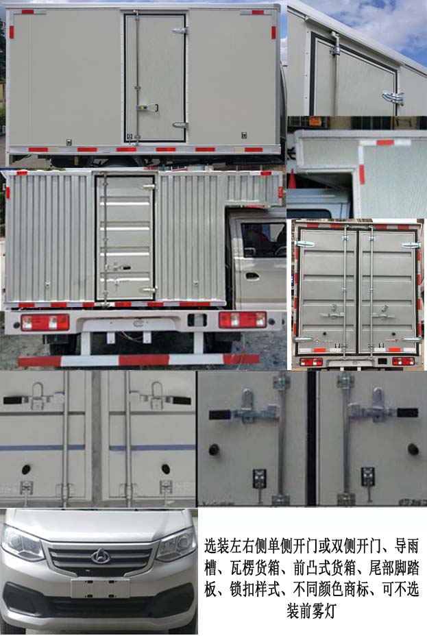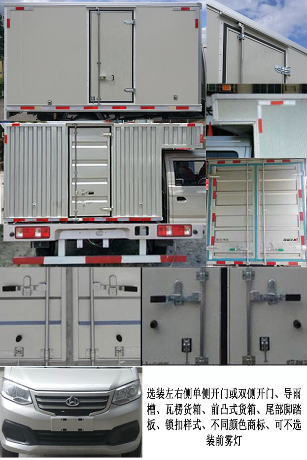 | 备注 | 1.选装部件:左右侧单侧开门或双侧开门,导雨槽,尾部脚踏板,锁扣样式,反光膜型反光标识,瓦楞货厢(瓦楞货箱时货箱内部宽度为1650),前凸式货厢,MP5,倒车可视,电动门窗,中控锁,空调,选装不同颜色商标,可不选装前雾灯.2.LJ469Q-AEB发动机对应油耗值为7.5L/100km,最大净功率为62kW.3.车厢顶部封闭,不可开启.4.ABS控制系统型号/生产企业/控制方式:YF8/武汉元丰汽车电控系统有限公司/四通道式. | ||