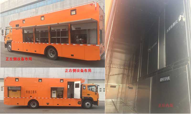 | 备注 | 车厢顶部不可开启;该车型主要用于市政设施焊接修复、应急救援抢修;主要专用装置:发电机组、液压动力站、电焊机、气泵、真空泵、等离子切割机、照明灯具、工具箱等;ISF3.8E6168发动机最大净功率122kw,ISF4.5E6180发动机最大净功率129kw;ABS系统型号/生产企业:44600XXXX0/威伯科汽车控制系统(中国)有限公司;安装符合规定的具有卫星定位功能的行驶记录仪;侧、后部防护材料均为Q235A;侧防护采用裙边结构,离地高度:350mm,后下部防护装置的截面尺寸(长×宽×高):2230mm×60mm×120mm,离地高度:490mm,连接方式为螺栓连接. | ||