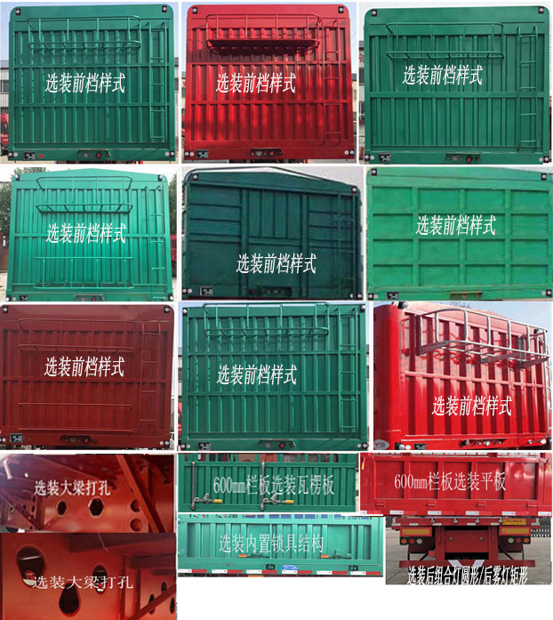| 备注 | 车厢底板到仓栅顶部高度与总高的对应关系为:1800mm/3380mm;2000mm/3580mm;2200mm/3780mm;2400mm/3980mm.选装前档样式;选装长锁杠或短锁杠或隐形锁杠的对开门仓栅结构,选装两层,三层仓栅,前后箱板上弧板,篷布框及前爬梯为选装件;后部选装花栏式后门,三开扇式后门,对开式半封闭后门,对开全封闭样式;选装圆形立柱;选装大梁打孔;选装空气悬架;选装后组合灯圆形/后雾灯矩形;选装内置锁具结构;整车栏板选装平板/瓦楞板.一,ABS:型号:HNABS4S/2m-4S/4m;生产厂家:山东海纳汽车科技有限公司.二,防护:防护材料均采用Q235B,与车辆连接方式为焊接.后防:离地高度为490mm,断面为140mmX50mm.牵引销中心到车辆前端距离/车长/轴距/后悬对应关系为(mm):1200/13000/6880+1310+1310/2300;1300/13000/6780+1310+1310/2300;1400/13000/6680+1310+1310/2300;1300/12500/6480+1310+1310/2100;1200/12000/6280+1310+1310/1900. | ||
